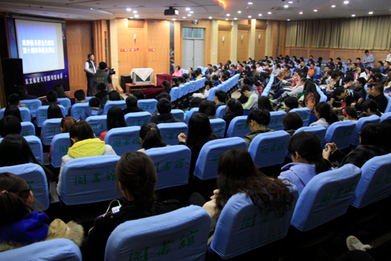 接着,侯先生讲述了自己的求职经历和奋斗历程,“一周六封真诚的求职信”、“635元的全班最低工资”、“南下广州的艰苦奋斗”、“挥师北上的摸爬滚打”……,侯先生用自己的经历告诉同学们只有自己主动面对和挑战困难,才会实现自己想要的人生。他告诫同学们,大学时代通过多方位锻炼获得的广博知识面与处事能力,可能会成为在工作中有别于他人,脱颖而出的必备法宝。