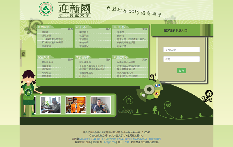 为方便2014级新生全面了解学校情况及入学报到相关事宜,尽可能地让新生在第一时间熟悉并适应崭新的大学校园生活,党委学工部精心制作并开通了2014年迎新专题网站。网站设有“报道导航”、“走进东林”、“学在东林”、“家在东林”、“成长在东林”、“新生信息港”等栏目,全面介绍了东北林业大学的总体状况、学习生活设施、校园景观等内容,同时对东林整体的学生成长成才服务体系进行了介绍。在往年迎新网的基础上,今年网站的整体设计突出清晰直观、简洁大方的设计特点,把同学们需要关注的网络平台、以及需要登录的数字迎新系统入口都放在了比较明显的位置,以便更好的服务于新同学。