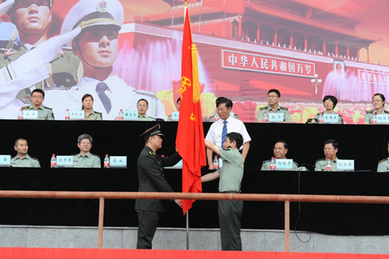 党委书记吴国春代表学校党委向军训团授旗,副校长、军训团团长李斌代表军训团接旗,军训团一营营长于洋从军训团团长手中接旗。