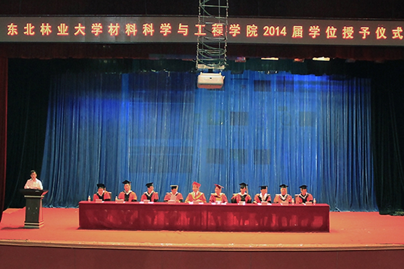 仪式在一段充满回忆色彩的视频中缓缓拉开帷幕,奏唱国歌后,仪式正式开始。首先,材料科学与工程学院院长刘守新教授宣读了2014届本科毕业生名单及授予学士学位的决定。副院长沈隽教授宣读2014届东北林业大学“优秀毕业生”名单。主席台就座的各位领导及老师向毕业生们颁发毕业证及学位证书,并拨正流苏。