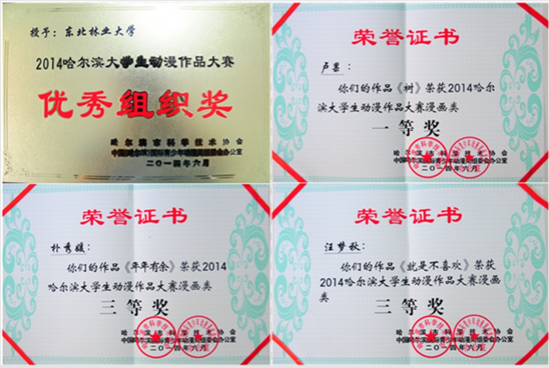 由哈尔滨市科学技术协会、中国(哈尔滨)国际青少年动漫周组委会办公室联合组织开展的2014哈尔滨大学生动漫作品大赛自2014年2月开展以来得到了哈尔滨市各大高校学生的广泛关注。根据大赛要求,学校积极组织广大在校学生及社团,充分利用官方网站、微信、微博、BBS等宣传平台,充分调动学生们的积极性和参与热情,通过征集、选拔、专业指导、推荐等环节认真组织、积极提交作品。日前,评选结果揭晓,在我校提交的26份作品中,共有3份作品获奖,其中材料科学与工程学院2012级视觉传达专业的卢果同学的作品《树》荣获漫画类一等奖;土木工程学院2012级城市规划专业的朴秀媛同学的作品《年年有余》和文法学院2013级政治学与行政学专业的汪梦秋同学的作品《就是不喜欢》分获漫画类三等奖。我校荣获优秀组织奖。