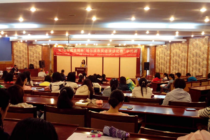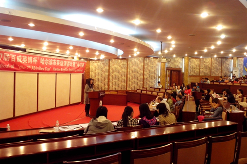 5月25日早8点,第七届“百威英博杯”哈尔滨市英语演讲比赛半决赛在我校动资楼331会议室准时举行。莅临本次比赛的嘉宾有外国语学院院长王丹教授、经济开发区招商局主任任文霞、哈尔滨工业大学外国语学院田强教授、哈尔滨工程大学外国语学院副院长邓小明以及我校外国语学院外籍教师Ben Watson和Bridge Waston。我校外国语学院2013级英语专业的同学作为观众在现场观摩了比赛.