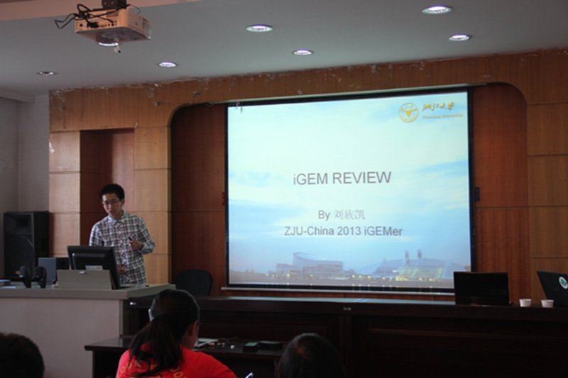 交流会伊始,由NEFU-iGEM筹备组秘书李晨老师向大家介绍刘族凯和王皓仙两位嘉宾的基本情况。接下来两位嘉宾分别给大家做了精彩报告。刘族凯同学分三个部分给大家做了报告:1、介绍iGEM的大致情况,包括介绍iGEM所依托的合成生物学及其主要原则;iGEM近些年来的发展状况;iGEM的分区;结合2013年iGEM比赛分析iGEM的流程等。2、介绍2013年ZJU-China的项目,包括浙江大学五年来iGEM的大致情况(队伍组成、选拔流程等)和自身在ZJU-China的一年中的收获以及感受等。3、介绍2013年英国帝国理工(世界第三)在MIT的presentation,让新队员直接感受在MIT比赛的氛围,了解presentation的实际情况。