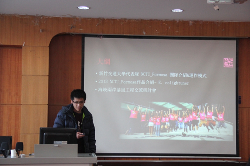 王皓仙同学主要从以下三个部分给大家做了报告:1、台湾国立交通大学代表队NCTU_Formosa团队介绍及运作模式。2、项目介绍—E.colightuner。3、海峡两个基因工程交流研讨会的基本情况。