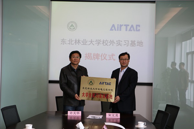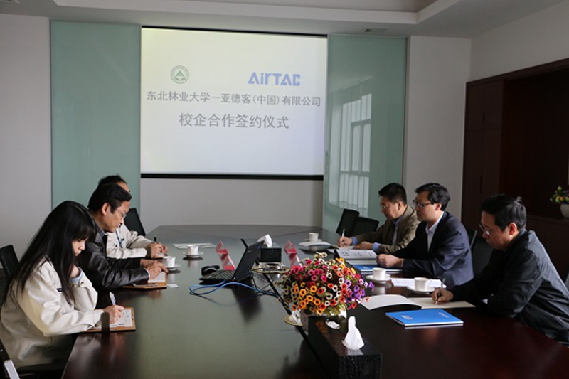 在考察了亚德客(中国)有限公司的生产情况和工业自动化教学装备技术中心后,在前期充分沟通的基础上,双方进一步就校企合作的相关事宜进行了认真讨论,宋文龙院长与许关华副总经理共同签署了“东北林业大学机电工程学院与亚德客(中国)有限公司校企合作协议书”,内容包括:1、在东北林业大学机电工程学院成立“东北林业大学机电工程学院-亚德客(中国)有限公司校企合作共建自动化实训中心”,亚德客(中国)有限公司免费提供教学实验用气动元件;在教学之余,中心可作为AirTAC东北地区产品展示中心,承接AirTAC在黑龙江及周边地区客户的机电一体化技术相关培训。2、在亚德客(中国)有限公司成立“东北林业大学机电工程学院大学生实习实训基地”, 亚德客(中国)有限公司每年接纳学院相关专业的本科生进行1-2周的专业实习;当亚德客(中国)有限公司有企业顶岗实习或招聘员工需求时,学院优先推荐优秀毕业生进行面试,面试合格后至企业顶岗实习或就业。3、亚德客(中国)有限公司每年定期派出高级工程师到校为学生进行专题讲座。4、为培养和提高学院专业教师的实践教学能力,亚德客(中国)有限公司每年为学院3-5名教师进行企业实践培训。