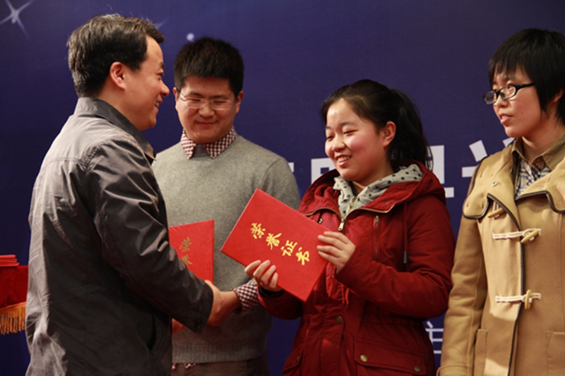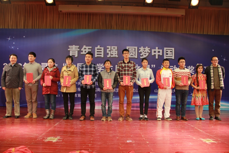 颁奖环节,团中央书记处书记傅振邦、新东方教育集团董事长兼首席执行官俞敏洪共同为荣获“中国大学生自强之星标兵”荣誉称号的10名同学颁奖。会上颁发了“高校优秀组织奖”,校团委书记艾曦锋上台领奖。