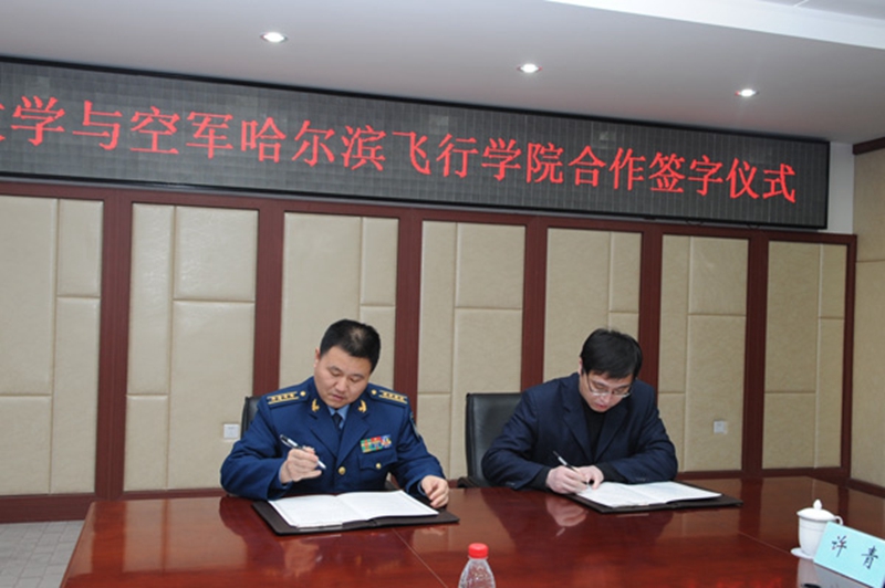 空军哈尔滨飞行学院后勤部部长陆纪荣与我校科学技术研究院副院长应天玉分别代表双方签署合作协议