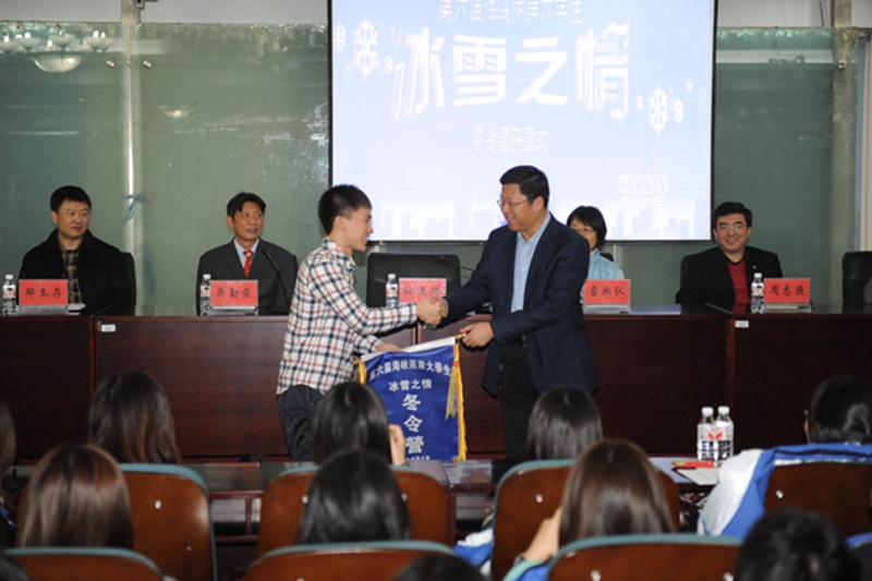 副校长孙正林向冬令营营员代表、台湾元智大学学生黄均蔚授冬令营营旗