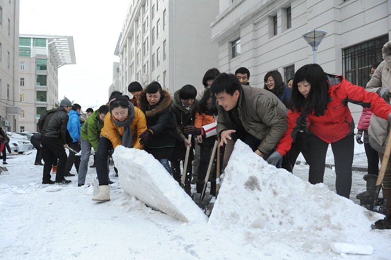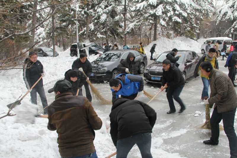 从18日开始,我校就有师生主动找来锹、镐,清扫校内积雪。19日,1000多名学生志愿者、辅导员老师在学生处、校团委的组织下走上街头,把幸福路、健康路、王兆屯等几条街路的积雪清扫干净。20日,党政机关、教务处、科学技术研究院、研究生院等部门的教工也在党的群众路线教育实践活动辅导讲座结束后,拿起清雪工具,用了近两个小时的时间将综合办公楼与图书馆之间的道路清扫了出来。机电工程学院教工也在院长、书记带领下,将主楼前的积雪清理干净。连日来,还有很多教工、学生自发地行动起来,在校园内外开展了清雪活动。