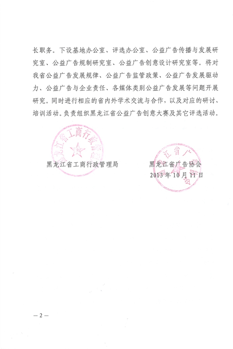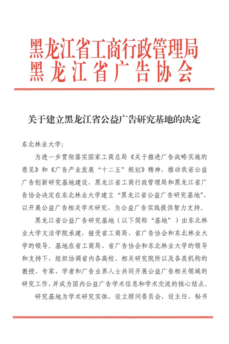 为进一步贯彻落实国家工商总局《关于推进广告战略实施的意见》和《广告产业发展“十二五”规划》精神,推动我省公益广告创新研究基地建设,黑龙江省工商局和黑龙江省广告协会决定在东北林业大学建立“黑龙江省公益广告研究基地”。我校成为第一家省级公益广告研究基地。