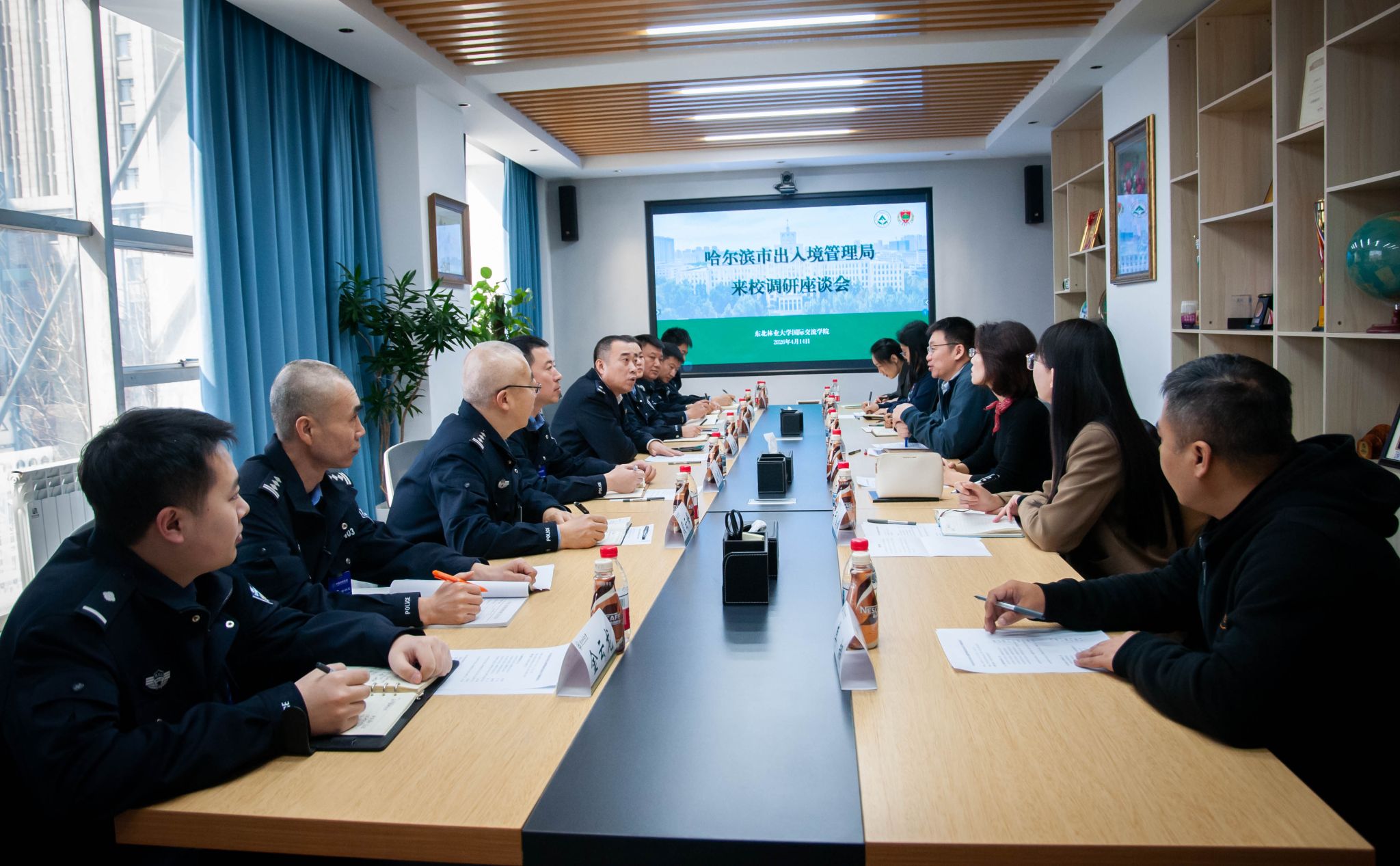 4月14日上午,哈尔滨市公安局出入境管理支队支队长张洪涛,政委马丽,副支队长孟祥崑、张岩一行莅临我校,就外籍师生管理工作进行专题调研。调研座谈会在国际交流学院会议室举行。会议由国际交流学院院长王博主持,国际合作处、国际交流学院相关科室负责人参加会议。