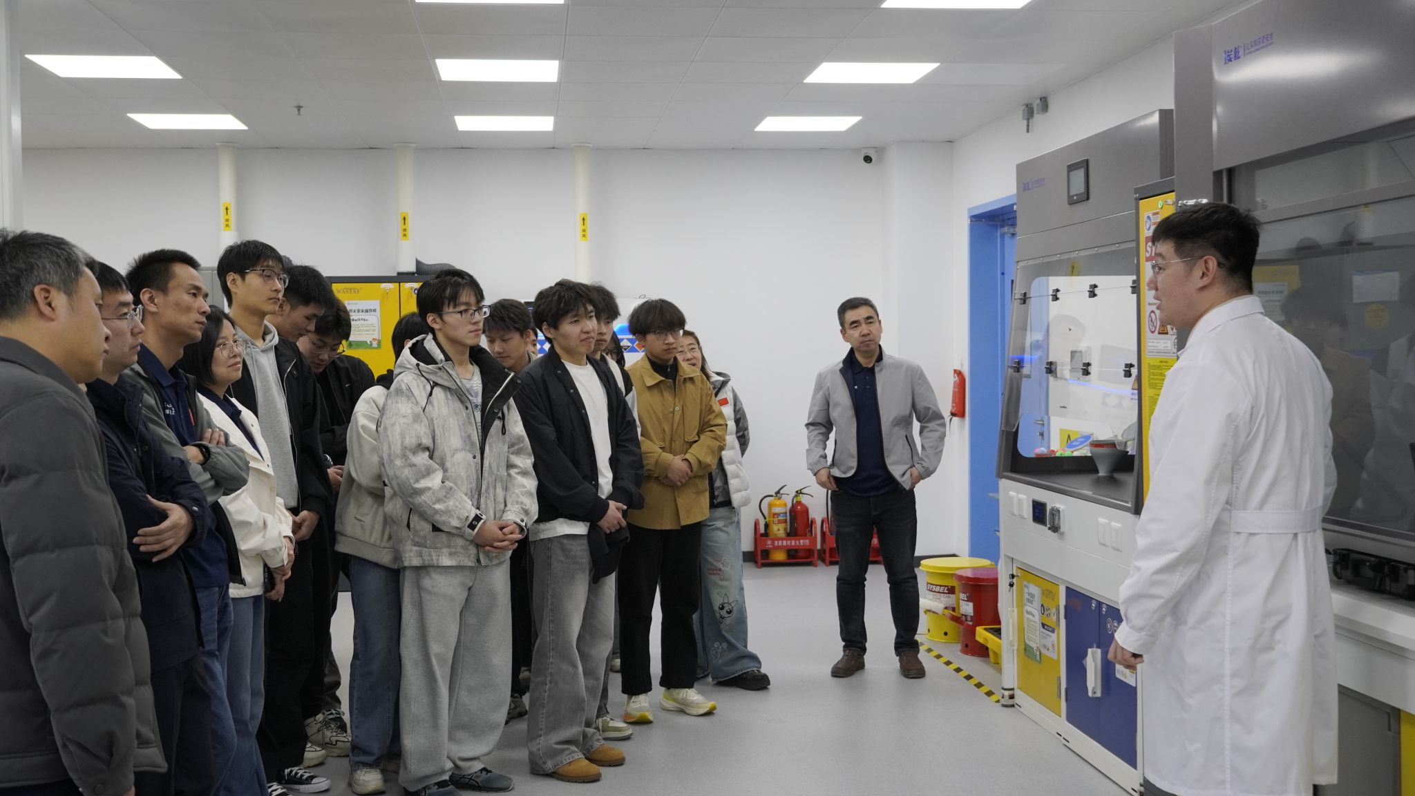 在郭敏、刘正的指导下,师生们开启了学习体验之旅。EHS(环境、健康与安全)中心作为东北首家高校实验室教育实践体验中心,设有化学安全区、生物安全区、气体安全区、个体防护区、应急处置和设备操作安全区等6个区域。每个区域均配备了先进的实验和互动体验设备,师生们可以亲手操作、动手实践,这种身临其境的体验体悟,打破了传统实验安全教育的刻板印象。