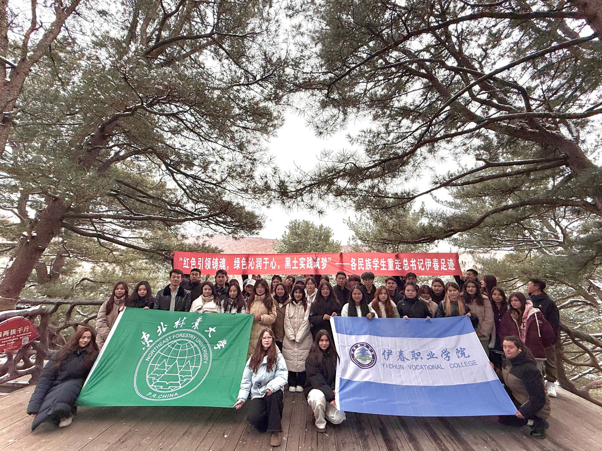 座谈会后,两校师生共同前往溪水森林公园,开展“红色引领铸魂,绿色沁润于心,黑土实践筑梦”——各民族学生重走红色足迹研学活动。沿着习近平总书记考察伊春时的路线,师生们漫步于林海间,近距离感受伊春在生态文明建设中的显著成果——挺拔的红松、清澈的溪流、银装素裹的植被,无不展现着“绿水青山就是金山银山”“冰天雪地也是金山银山”的生动实践。大家在沉浸式体验中深刻领会习近平总书记对生态文明建设的重要指示精神,也进一步增强了守护生态环境、传承绿色发展理念的责任感与使命感。