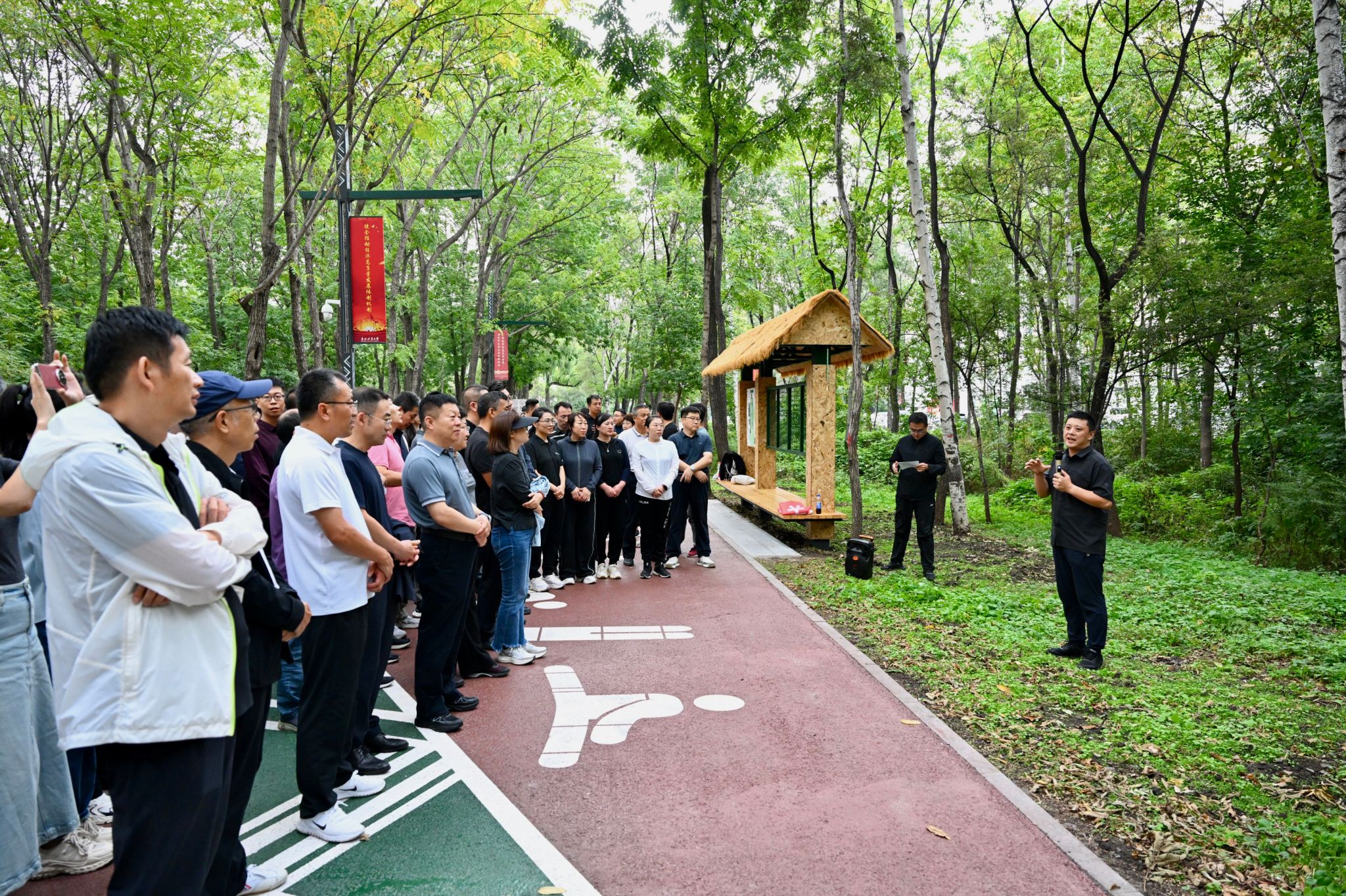 在活动启动仪式上,校园建设处副处长姜晓东向大家介绍了建设森林生态跑场的初衷和意义以及跑场的基本情况。森林生态跑场以“三重同心环”布局,三条独立成圈又彼此连通的环形路线总长2千余米,配套古朴驿站与多样化健身器材,既满足运动需求,又守护着“松鼠伴跑、落叶共舞”的自然生机。