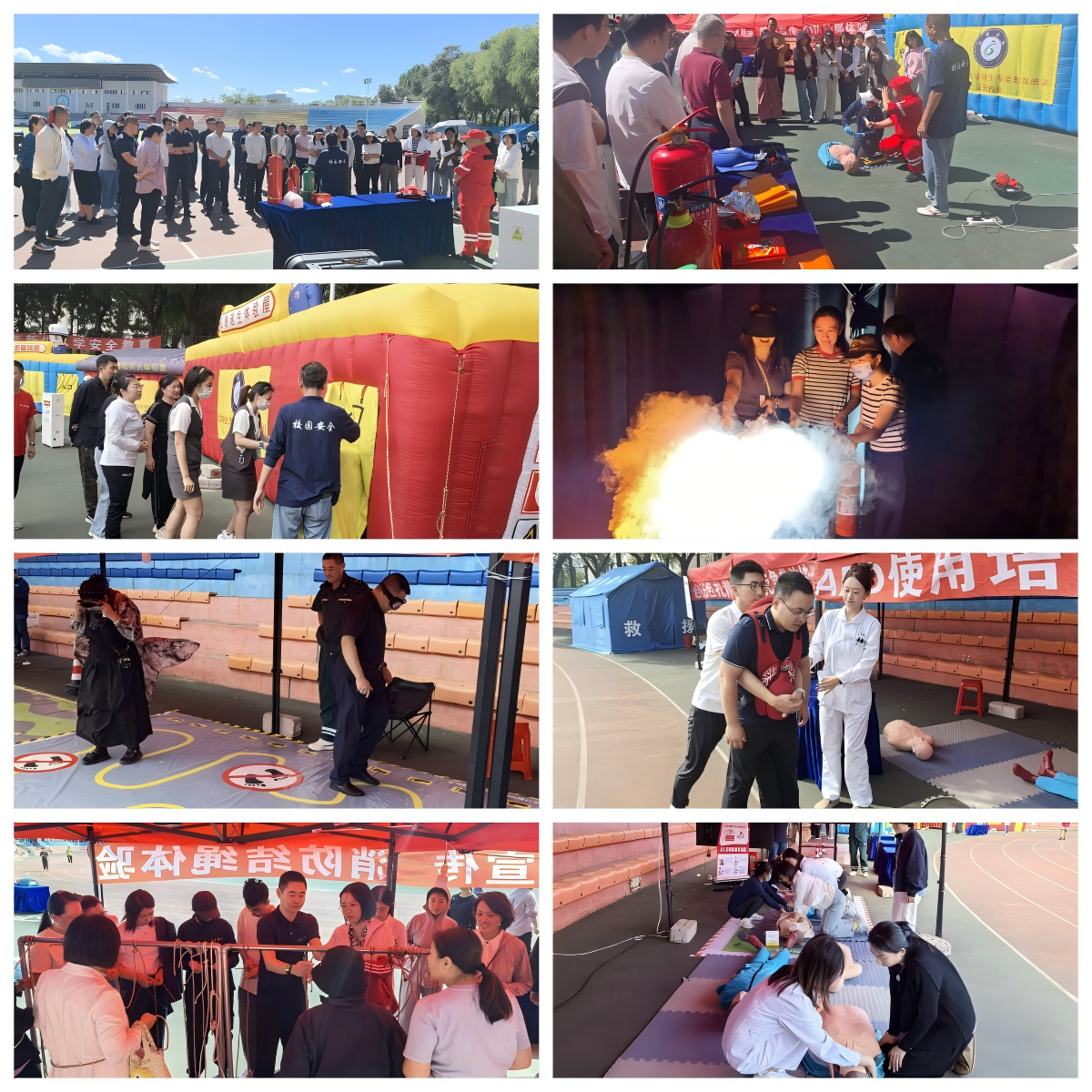 活动现场气氛热烈,参训教职工在工作人员引导下认真聆听操作规范讲解,积极投入各项实训环节:在消防逃生、灭火器操作到醉酒体验、海姆立克急救法等场景化训练中,大家严格遵守操作规范和动作要领,在模拟情境中反复练习和尝试,力求熟练掌握各项器械的使用方法以及急救和应急逃生技能。