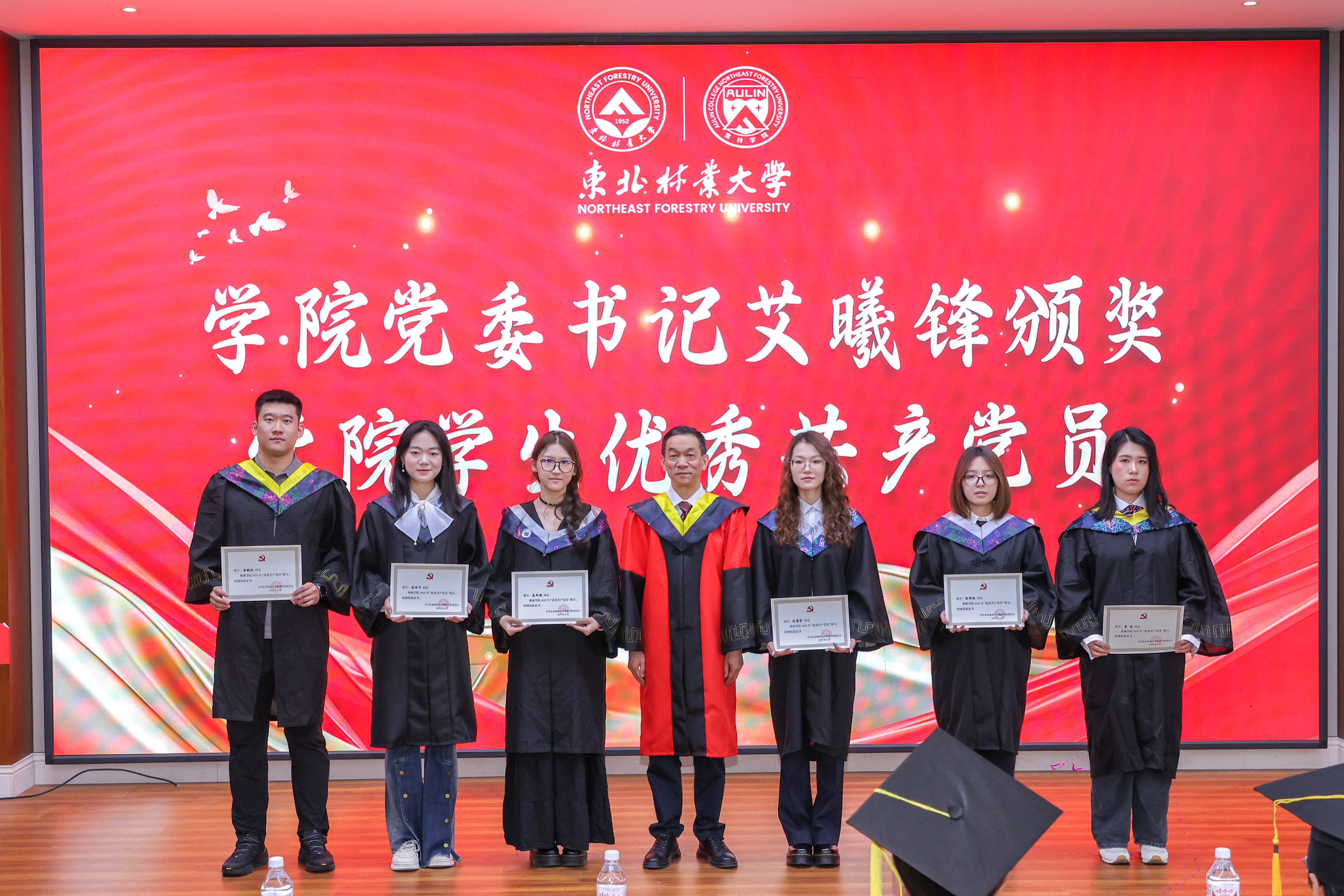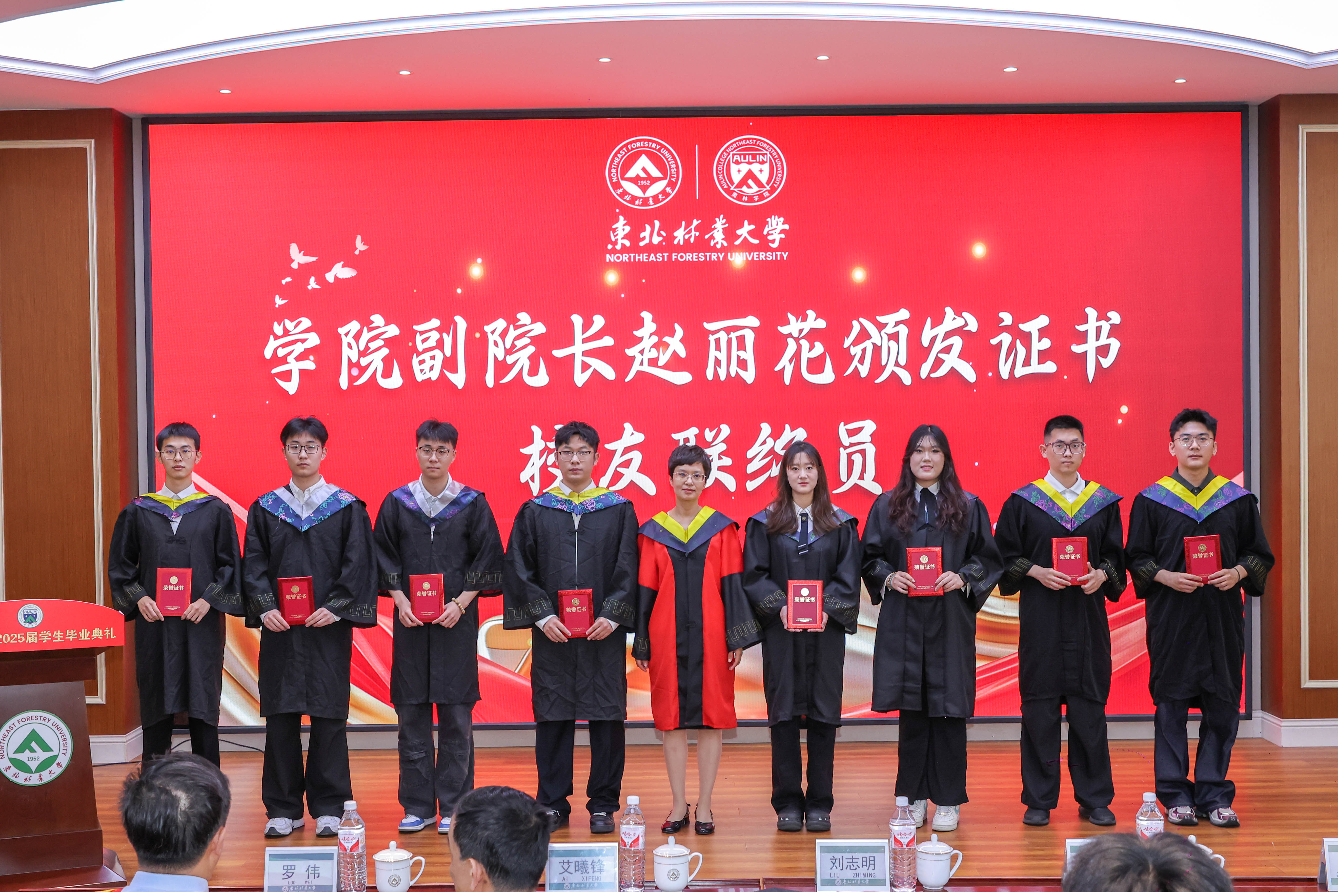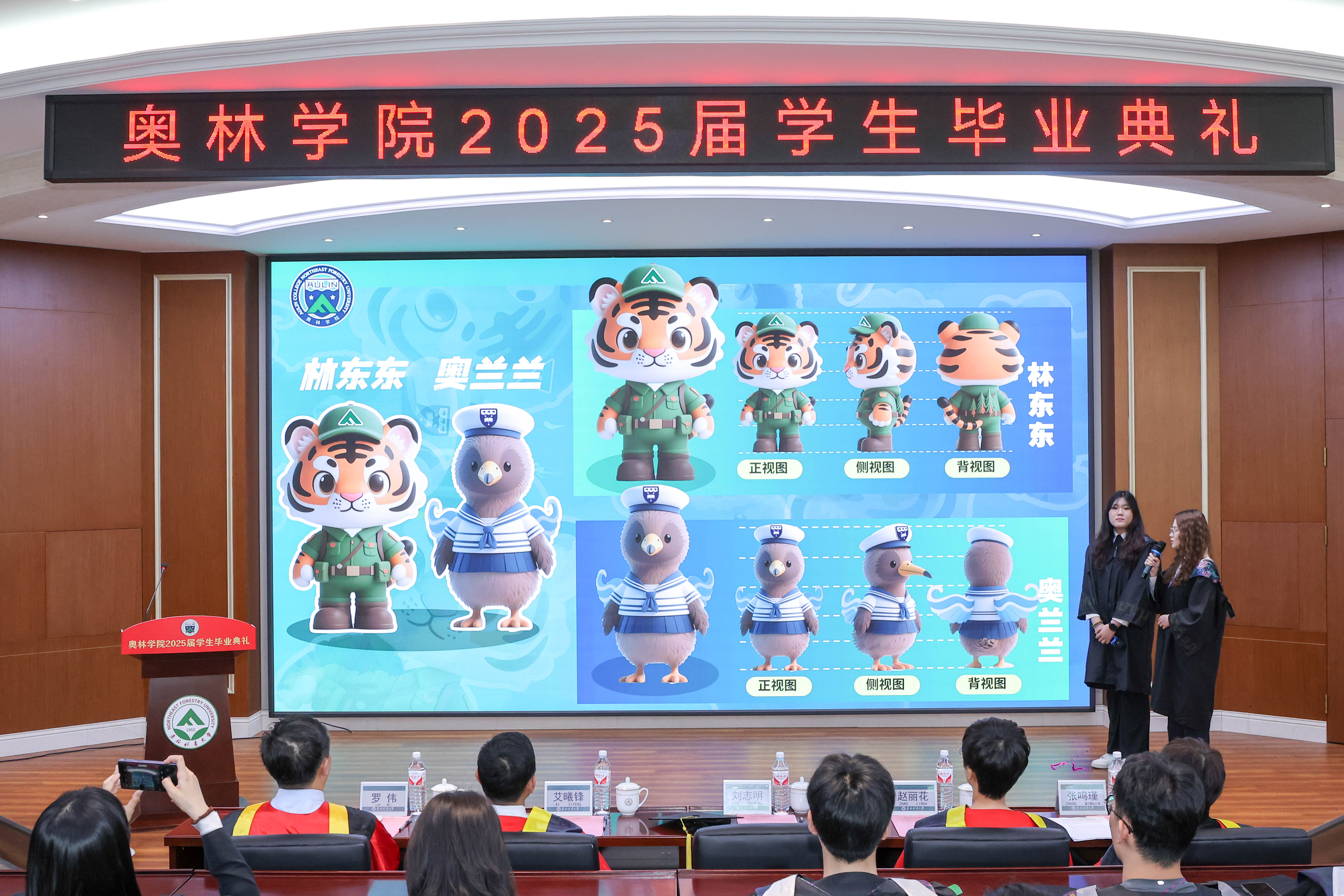 毕业生代表王润杰、赵慧哲向学院献上饱含寓意的吉祥物作为临别之礼,“奥兰兰”和“林东东”既体现了以林育人的生态文明理念和东林精神,又彰显着对于可持续发展的深刻承诺和实际行动。