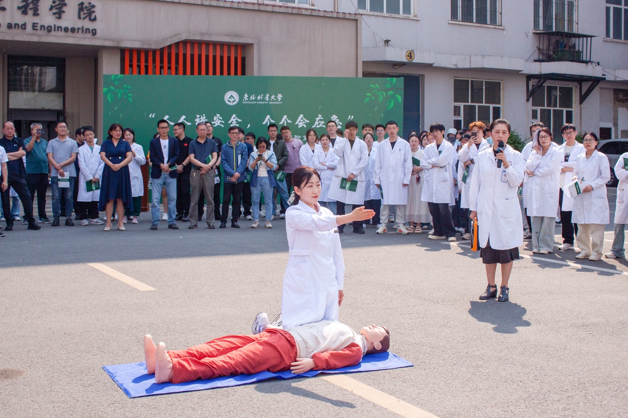 AED急救演练是本次演练新增内容。校医院副院长马直勉现场演练人体模型演示心肺复苏术(CPR)与自动体外除颤器(AED)协同操作流程,参训师生分组完成“判断意识-呼叫救援-胸外按压-除颤电击”全流程实操,掌握“第一目击者”急救技能。