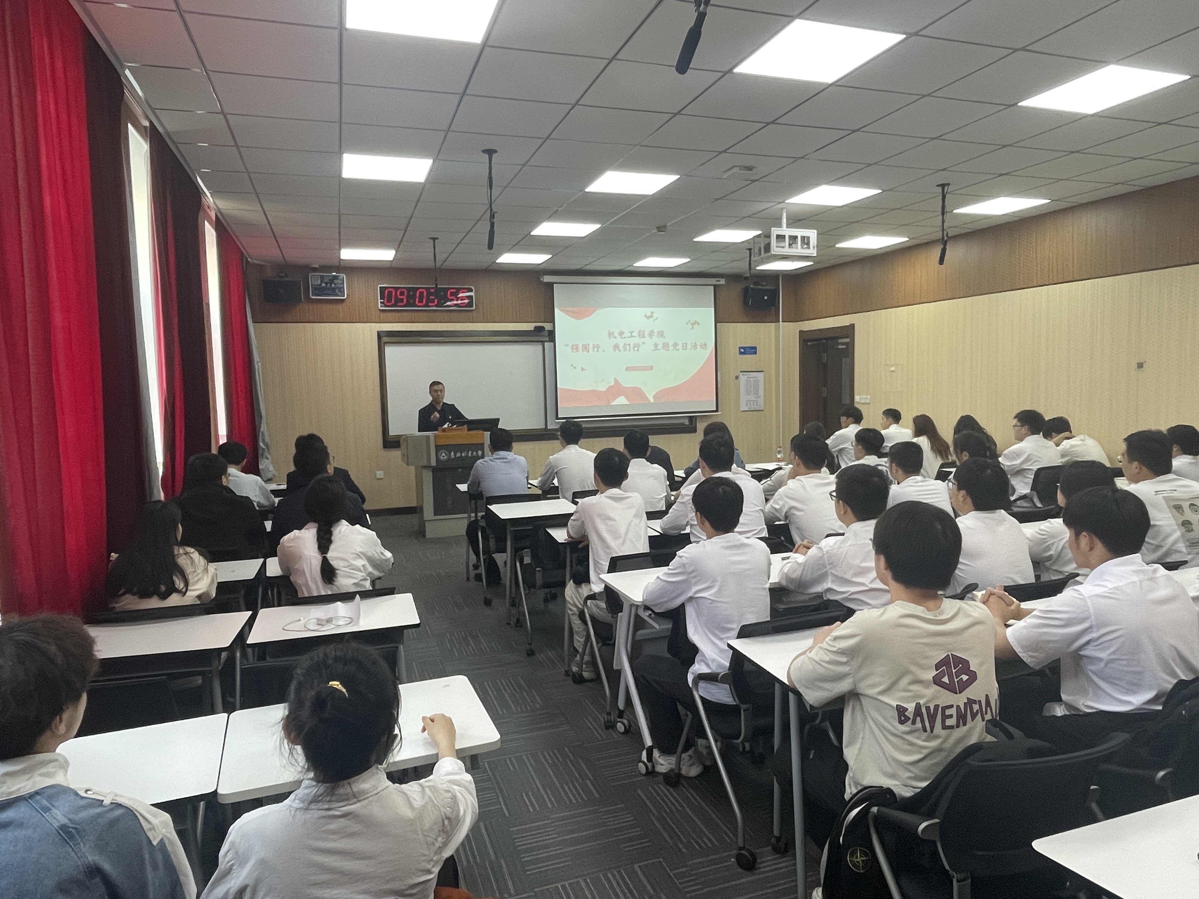 王佳彤简要介绍了举办此次主题党日活动的特殊背景:一是时间节点特殊。恰逢“五一”国际劳动节、五四青年节来临,统筹国内经济工作和国际经贸斗争,深入贯彻中央八项规定精神,落实《教育强国建设规划纲要(2024—2035年)》,筹备召开学校第十四次党代会,迎接本科教育教学审核评估的关键时期。二是参加人员特殊。既有经验丰富、德高望重的教育部党建联络员列席,也有党员领导干部、教师党员、学生党员、入党积极分子各层面代表。三是活动内容特殊。“强国行”专项行动团队负责人、全省高校样板党支部书记、全省优秀教育工作者联袂上台,共话成长、进步、思考,互学互鉴、互联互促。希望大家认真聆听,深入学习,广泛交流,为实现以高质量党建引领高质量发展的机电党建工作贡献力量。