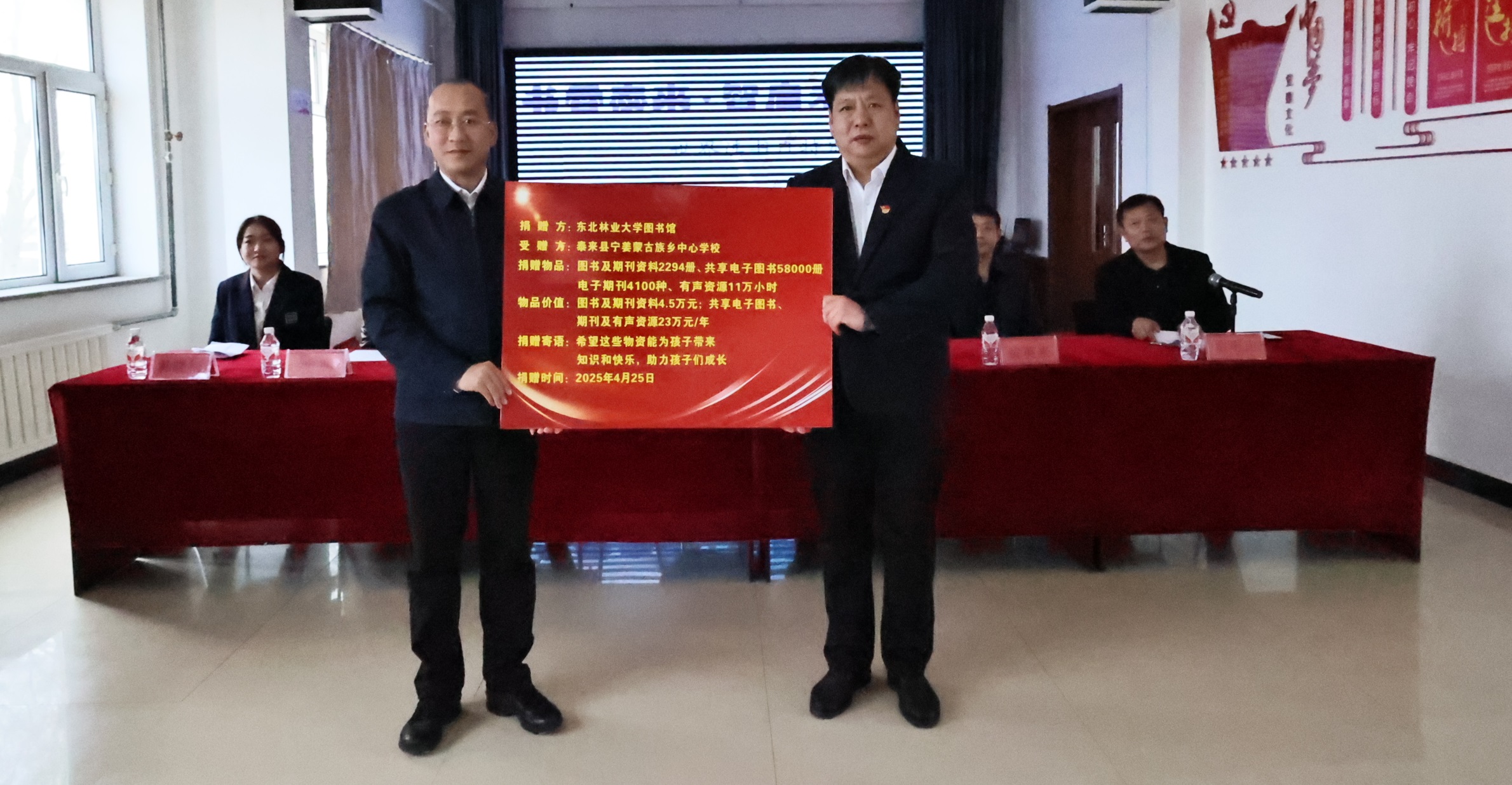 当天举行学校图书馆与宁姜蒙古族乡中心学校图书捐赠交接仪式。学校乡村振兴办公室主任付晓东、宁姜蒙古族乡中心学校校长赵会分别代表双方完成交接。此次捐赠图书及期刊资料2294册、共享电子图书58000册、电子期刊4100种、有声资源11万小时,价值约27.5万元。