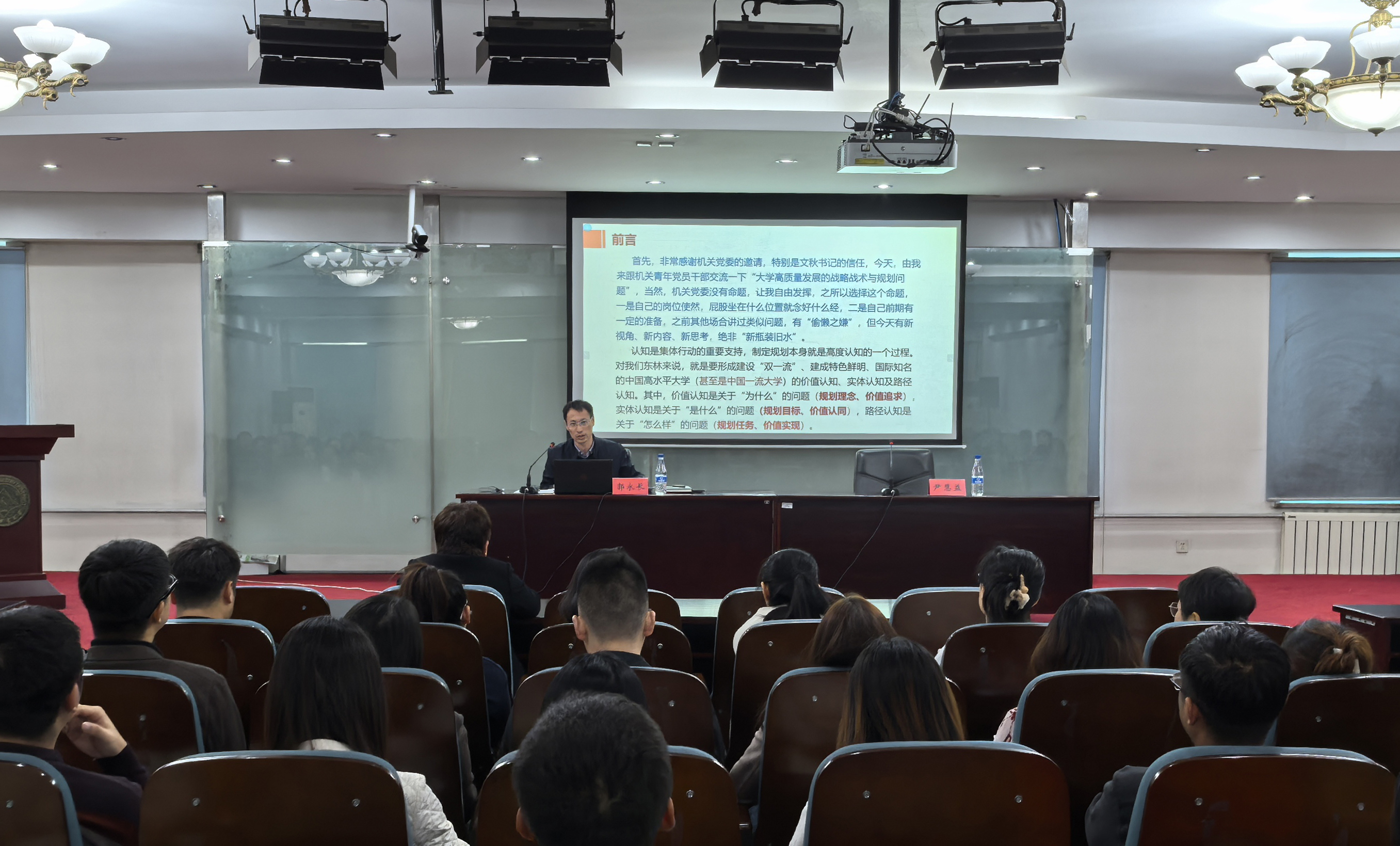 在谈到对中国高等教育发展战略定位的认识时,他详细介绍了大学高质量发展战略规划的基本内容,分析了国内外一流大学战略规划的有效经验,为青年党员提供了宝贵的理论与实践指南。