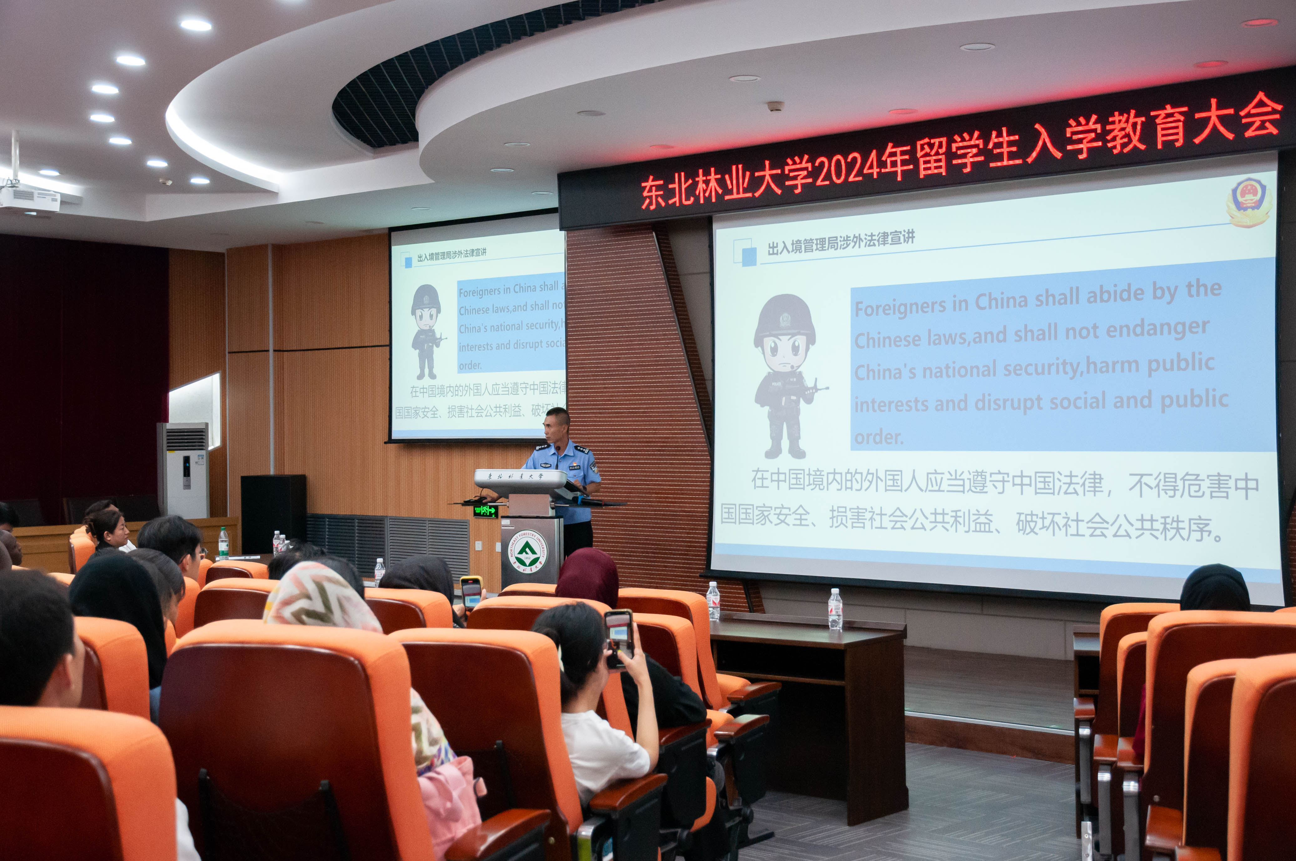 入学教育活动中,哈尔滨市公安局出入境管理局外国人管理科一级警长金云龙为留学生新生作中国法律法规宣讲。金云龙用英文为同学们详细解读了《中华人民共和国外国人出入境管理条例》,强调了留学生在中国境内期间须遵守中国法律法规,不得危害中国国家安全、破坏社会公共秩序,严禁非法入境、非法居留、非法就业,帮助留学生树立法治思维,提升法律意识。