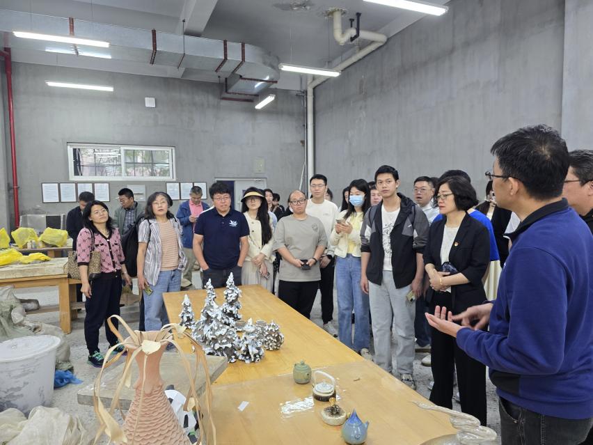 参与人员分别参观学习了艺术实验中心的陶艺工作室、漆艺工作室、纤维工作室以及服装实验室,分别了解了地域特色冰花瓷的制作、漆画的制作以及哈尔滨学院艺术实验中心服务社会经济文化建设的各项成果。冰花瓷的制作深深吸引了大家的目光,据郭鹏程讲,冰花瓷纹理灵感来源于北方冬天的窗花,其形成过程自然未经修饰,每一件都独一无二、十分珍贵。