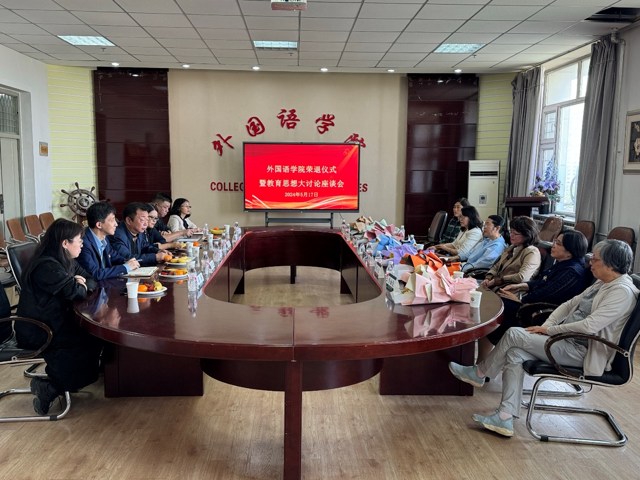 为进一步推动学校教育思想与高质量发展大讨论走深走实,充分发挥退休教师们的智慧和力量,5月17日下午,外国语学院在文博楼1210会议室举办了退休教师荣退仪式暨教育思想与高质量发展大讨论座谈会。学院退休教师代表李雨佳、张立杰、张艳红、吴芳、赵莉和吴恒菊6位老师受邀参会,学校离退休工作处处长李长松、党委书记徐岩出席会议,学院院长董辉,党委书记张斌,副书记、副院长郭林,副院长王佳音参会。会议由张斌主持。