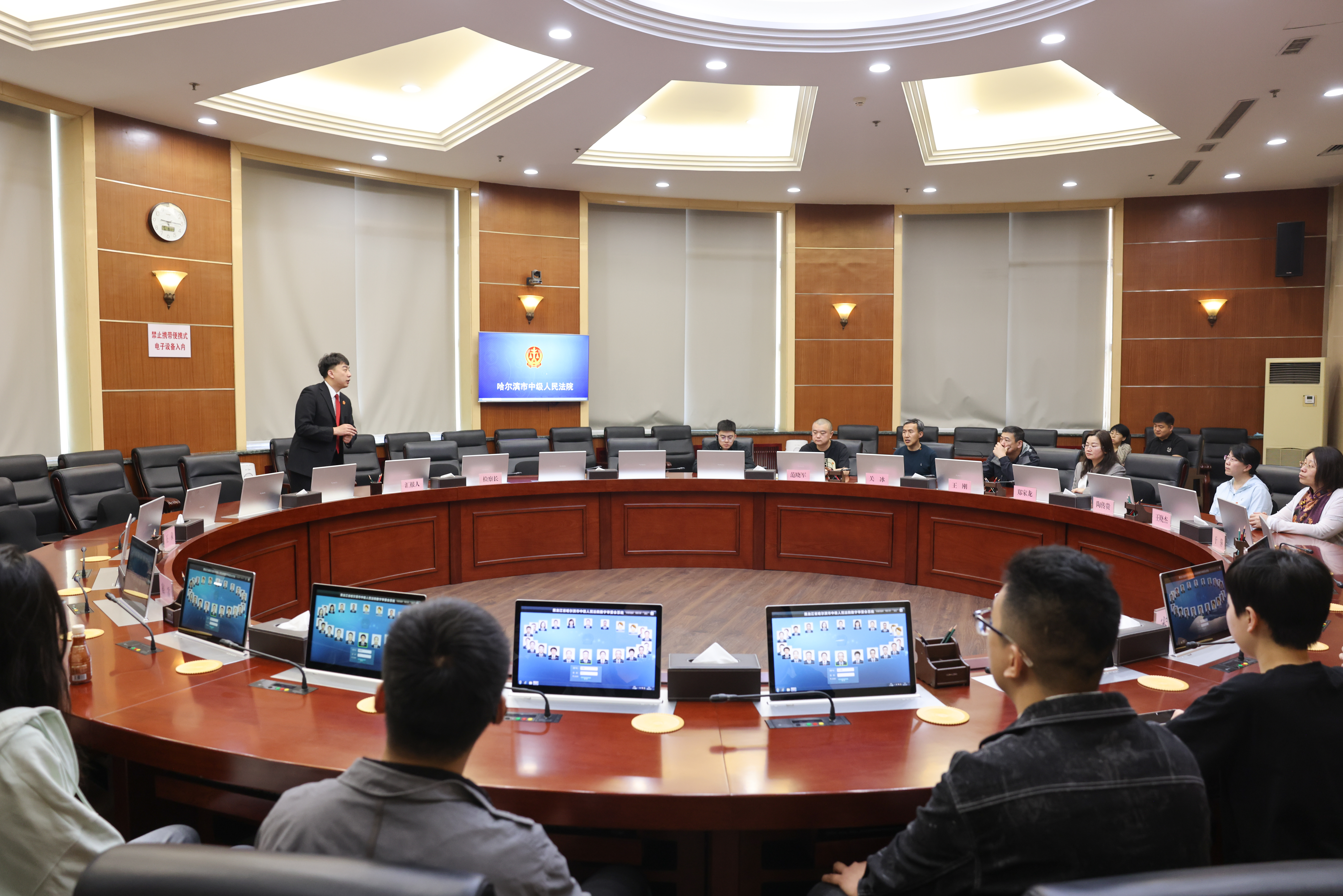 在法院工作人员的引导下,师生们先后参观了第二科技法庭、第六法庭、羁押室、审委会会议室、沿革长廊、信息集控中心等场所。在第二科技法庭,师生们体验了审判过程中视频、音频、多媒体证据的实时采集与储存,语言激励系统让同学们纷纷感叹科技赋能司法实践。走在法院沿革长廊,跟随时间线索,师生感悟了哈尔滨中院从1946年至今七十余年踔厉奋发、精业笃行的司法历程。在信息集控中心,大家共同观看了纪录片《烟火气里的司法味道》。