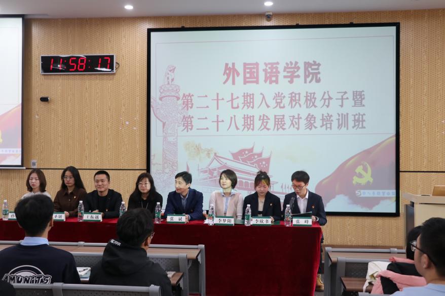 为深入学习党的二十大精神,不断加强对入党积极分子和发展对象的教育和培养,11月15日,外国语学院在奥林楼201室举办了第二十七期积极分子暨第二十八期发展对象培训班开班仪式。外国语学院党委书记张斌、党委副书记兼副院长郭林、副处级辅导员李梦阳,马克思主义学院辅导员王振越,外国语学院2021级辅导员李欣书、外国语学院22级辅导员王圣妍、实习辅导员孙雨晴出席了开班仪式。仪式由培训班班主任、2023级辅导员张峰主持。
