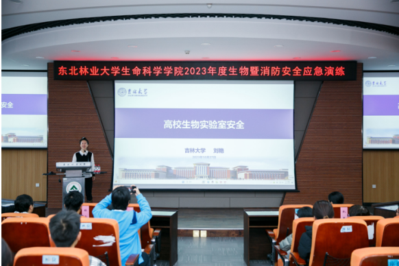 演练结束后,吉林大学刘艳研究员受邀在奥林学院101教室,为学院师生作了题为《高校生物实验室安全》的专题讲座,讲座由学院院长滕春波主持。本次讲座主题鲜明、案例典型,既生动有趣,又发人深省。随后学校实验室安全督查员赵娜作了实验室安全警示教育。
