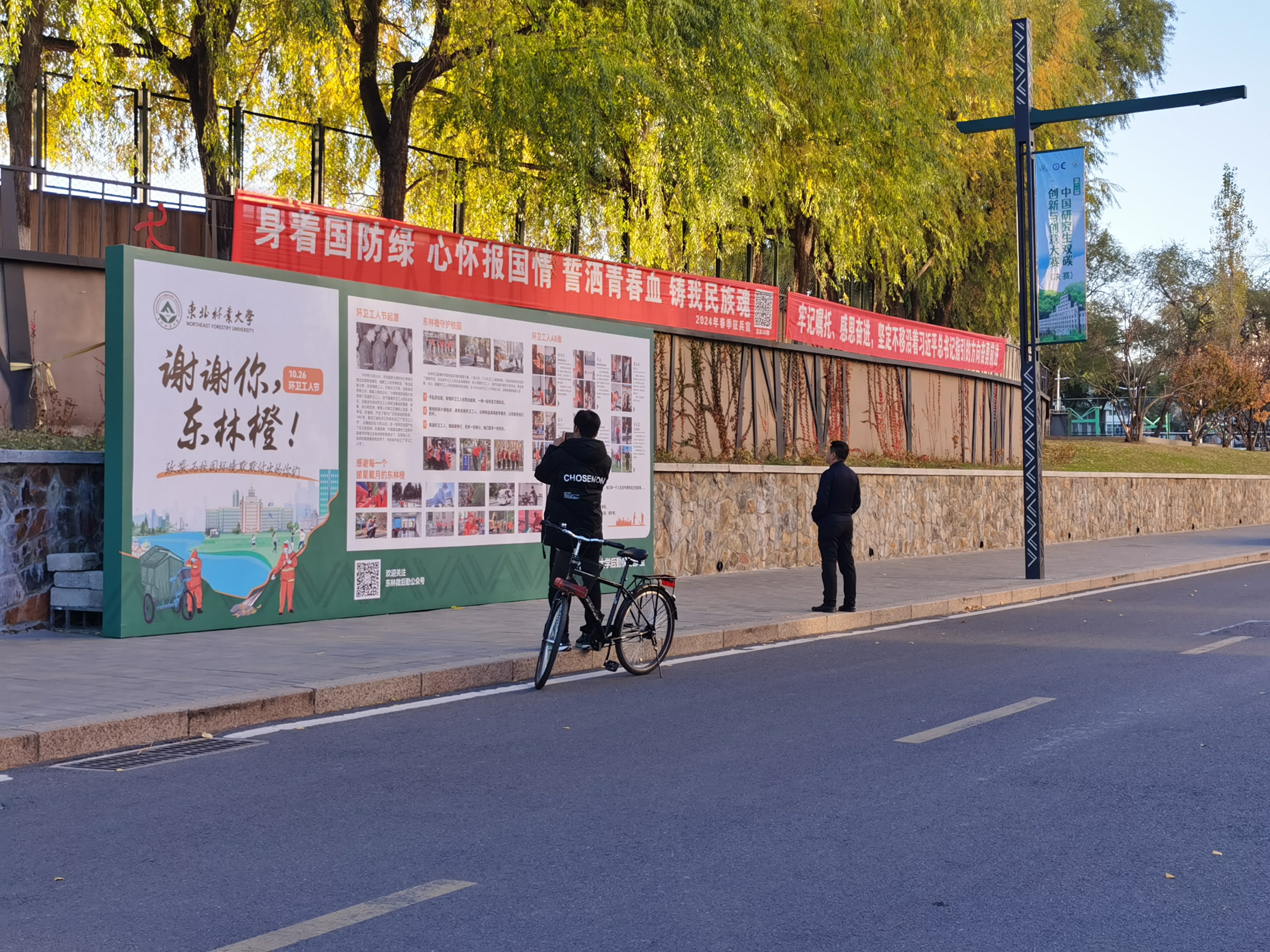 10月26日环卫工人节来临之际,后勤保障部在综合办公楼前设置了桁架,吸引了师生驻足观看。桁架展示了“东林橙AB面”主题拍摄成果,并发起关爱环卫工人的倡议。