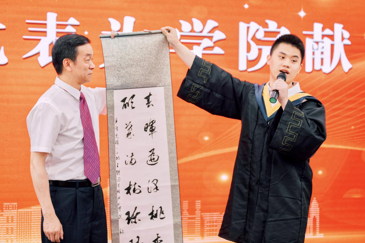 春晖遍泽桃李树,硕果满挂琼瑶枝。 2023届毕业生代表英智尧为学院献礼,行云流水、落笔云烟的书法作品饱含着同学们对母校深深的感恩与留恋。