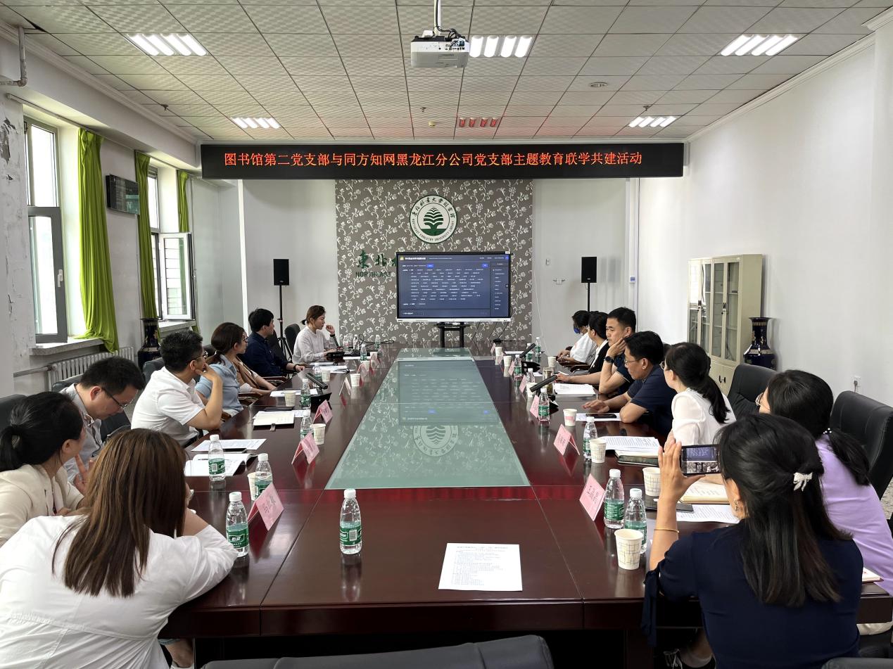 为全面学习贯彻习近平新时代中国特色社会主义思想,6月14日,图书馆第二党支部与同方知网黑龙江分公司党支部,联合举办了“党建引领聚合力,‘林’‘知’携手促提升”联学共建活动。图书馆党总支书记王晓明、馆长张凤斌、副馆长刘亚丽,同方知网黑龙江分公司总经理赵景海,党支部书记、副总经理卞妍参加活动。活动由图书馆第二党支部书记高珊珊主持。
