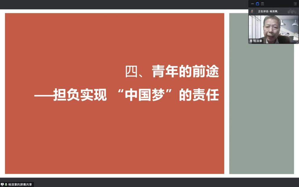 开班仪式结束后,外国语学院原党委书记杨滨章教授在线上以《党的使命与青年的责任》为题,带来本次党校培训第一讲。