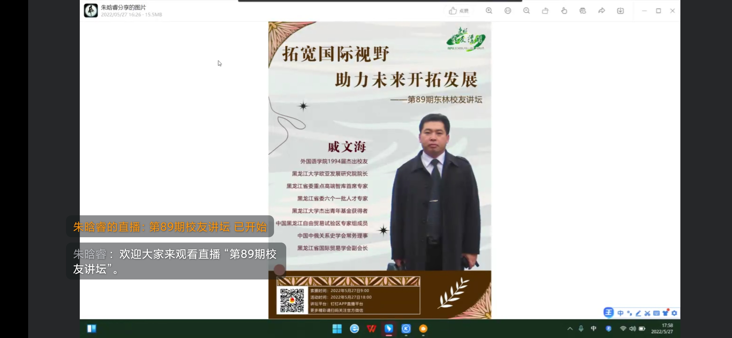5月27日18时,黑龙江大学欧亚发展研究院院长、东北林业大学杰出校友戚文海教授受邀做客第89期东林校友讲坛。本次讲坛以“拓宽国际视野,助力未来开拓发展”为主题,以全球化的视角为同学们未来的发展指明方向。