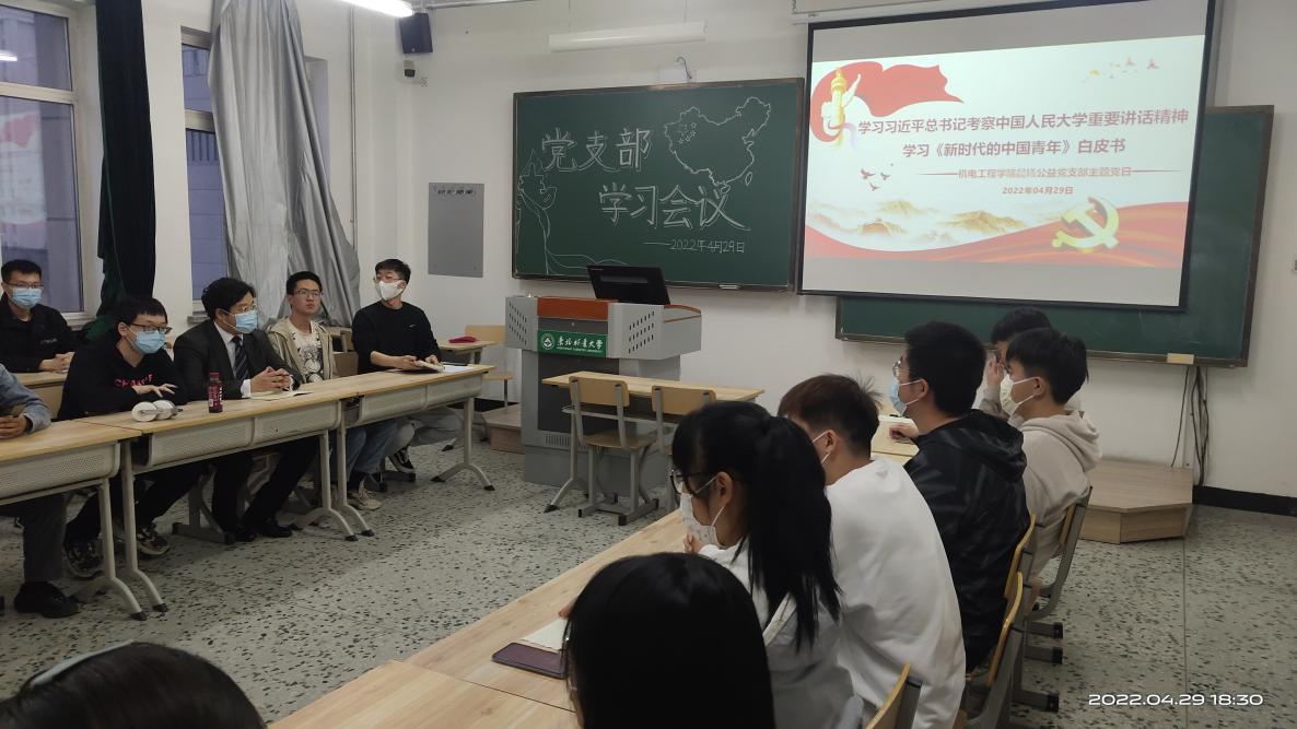 4月29日,机电工程学院晨曦公益党支部开展主题党日活动,结合新近发布的《新时代的中国青年》白皮书,学习贯彻习近平总书记考察中国人民大学重要讲话精神,交流分享学习心得。活动由支部书记、2021级本科生辅导员刘朝贤主持。