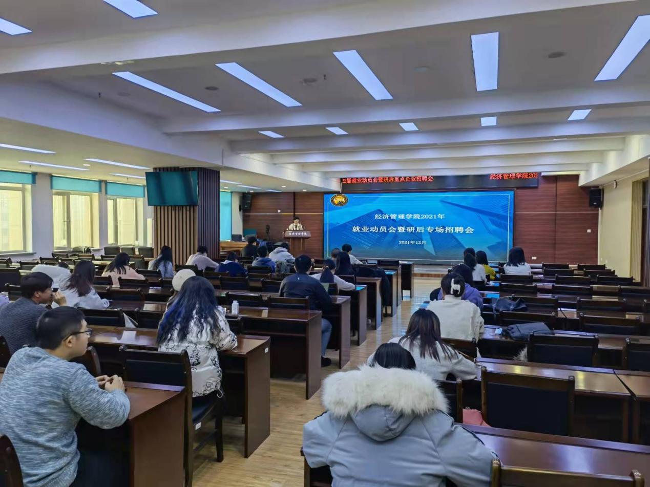 为使2022届毕业生特别是考研学生进一步准确把握就业形势,了解就业政策,2021年12月28日14时,经济管理学院于成栋楼1126会议室召开2022届毕业生就业动员会暨研后专场招聘会。经济学院党委副书记张艳波、团委书记王海飙、2018级辅导员张立垚以及部分2022届毕业年级学生参加会议。