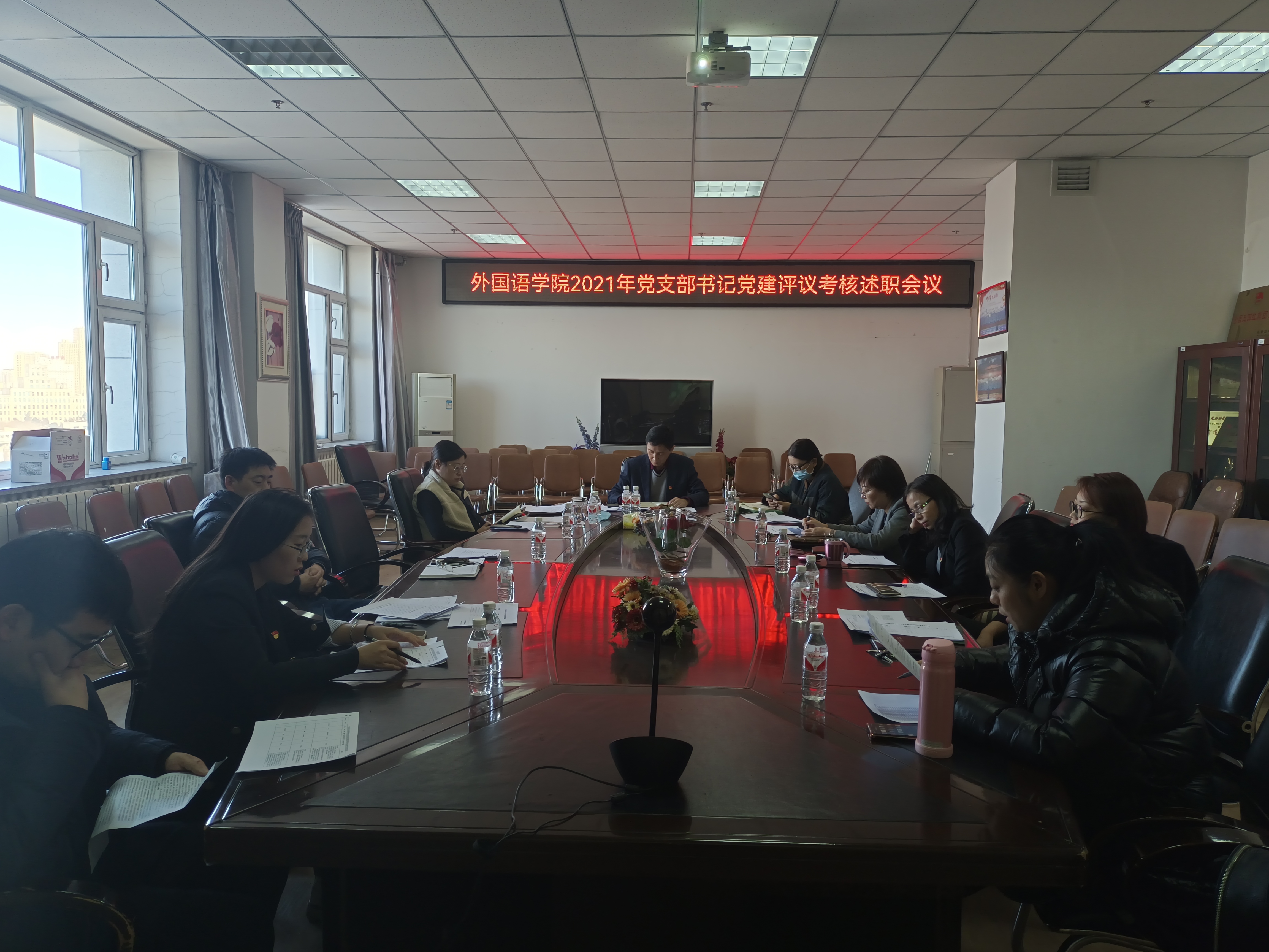 12月17日下午,外国语学院党委在文博楼1210召开了2021年支部书记党建评议考核述职会,会议采取线上线下相结合的方式举行。学院班子成员、党委委员、纪委委员及各党支部书记参加了本次会议。会议由学院党委书记张斌主持。