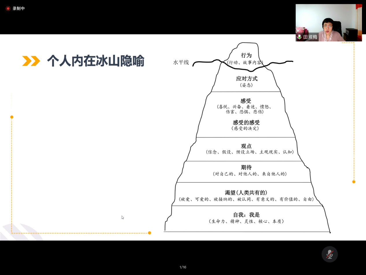 田淑梅教授在讲座的前半程向同学们介绍了情绪在人们生活里的作用和影响,她用生动的实例教给同学们使用“情绪保险箱”“冰山理论”等方法有效地管理自己的情绪,并带领同学们结合个人实际情况代入到冰山图中,形成对自己的总体认知,从而达到让学生更全面、深入地关注自身、了解自身的目的。