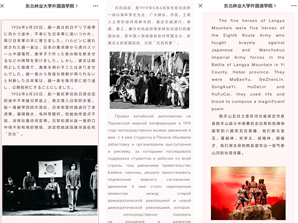 为发挥学院语言优势,拓宽“四史”学习渠道,贯彻落实习近平总书记关于“四史教育”的讲话精神,引导学生知史爱党、知史爱国,外国语学院第四十四期预备党员培训班于近日组织开展了“双语学四史”系列专题活动。