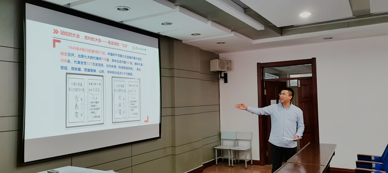 随后的微党课上,姚老师分析了党的第七次全国代表大会召开的背景,指出在德国法西斯面临彻底覆灭和中国抗日战争接近最后胜利的前夜,为了系统总结中国革命的基本经验,为了彻底打败日本侵略者、建设新中国做准备,在1945年4月23日至6月11日,党在延安召开了第七次全国代表大会;重点论述了七大的“党的政治路线”、“党的优良传统和作风”及“将毛泽东思想写在了党的旗帜上”;详细解读了七大的历史意义,以毛泽东主席在七大闭幕会上的致辞“我们开了一个很好的大会”“我们开了一个胜利的大会,一个团结的大会”结束了微党课的分享。