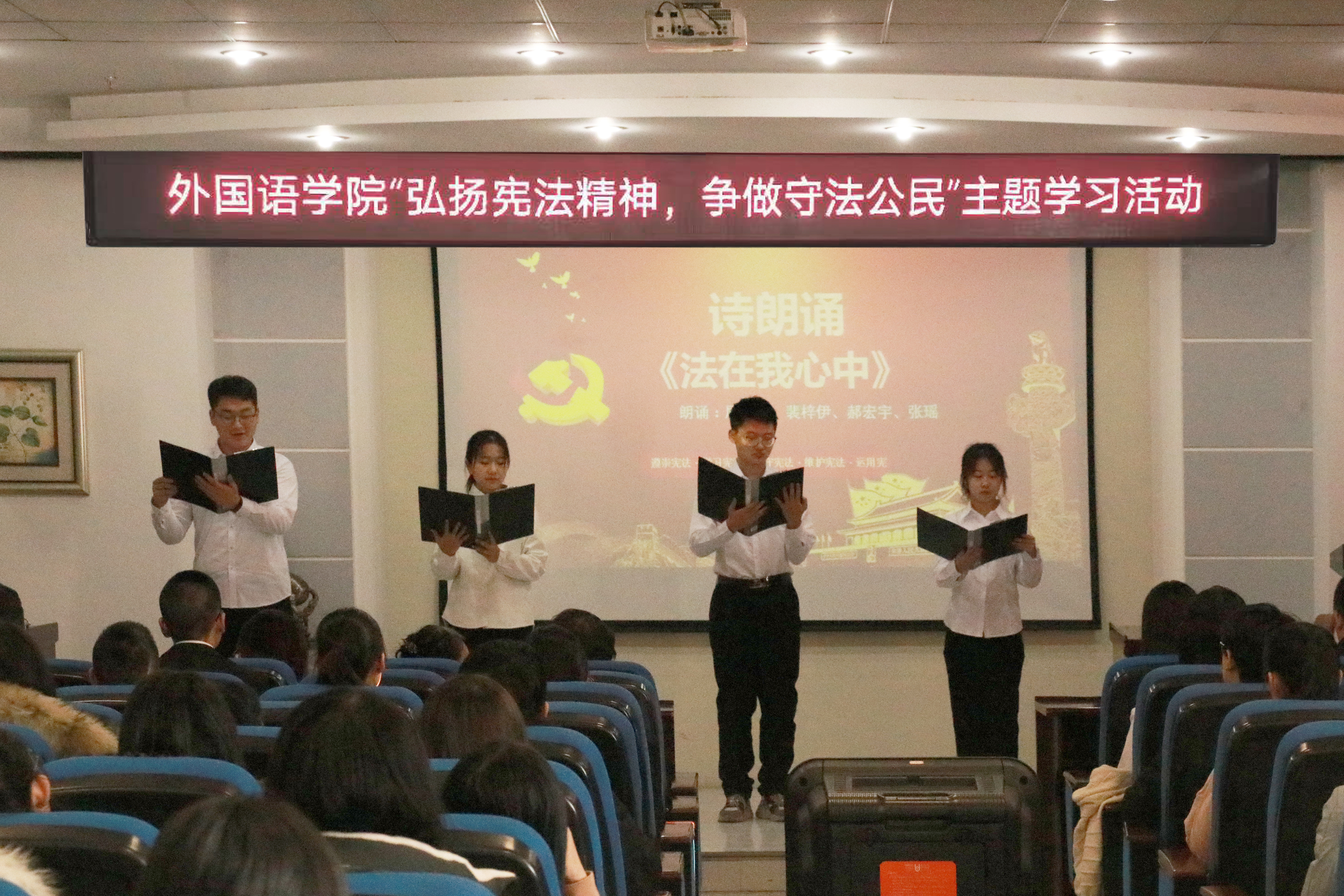 为“深入学习宣传习近平法治思想,大力弘扬宪法精神”,进一步加强外国语学院学生宪法意识,提高学生法制教育,培育学生法制观念。12月8日上午,在文博楼1019室开展了“弘扬宪法精神,争做守法公民”主题学习活动。