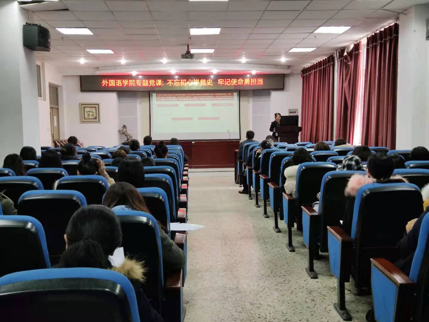11月18日,外国语学院于文博楼1019开展了“不忘初心学党史、牢记使命勇担当”专题党课学习活动,由外国语学院党委书记王丹主讲。参加党课的有全体教工党员及学生党员代表,共百余人。