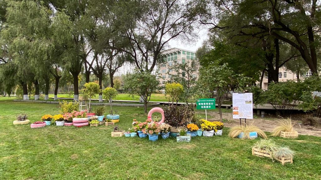 两组植物展示设计结合场地原有背景树,以彩叶盛花展示园林特色,拓展学生实践操作能力。在实践过程中,同学与同学、老师之间密切交流、默契合作,既增强了动手能力,又通过实践进一步熟悉了植物栽植、造景的方法,具有其独特的意义。