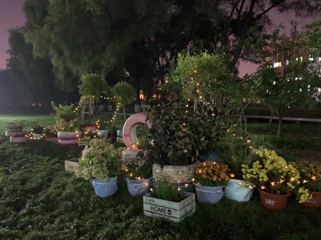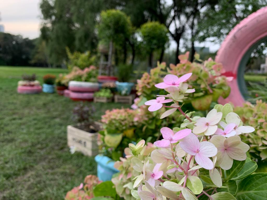 该设计以紫叶风箱果、金叶风箱果、金叶榆(Ulmus pumila‘Jinye’)及露地菊新品种“东林-辉煌”“东林-俏粉”为主,八仙花等观花植物为辅,红叶榆叶梅(Amygdalus triloba)作过渡,并在边缘以洁净的葱兰(Zephyranthes candida)、多彩的矾根(Heuchera micrantha)、飘逸的观赏草等向外延伸空间,增加灵动之感;此外,该小景使用装饰花架、彩喷轮胎和太阳能灯串等提亮色彩、增加趣味性。