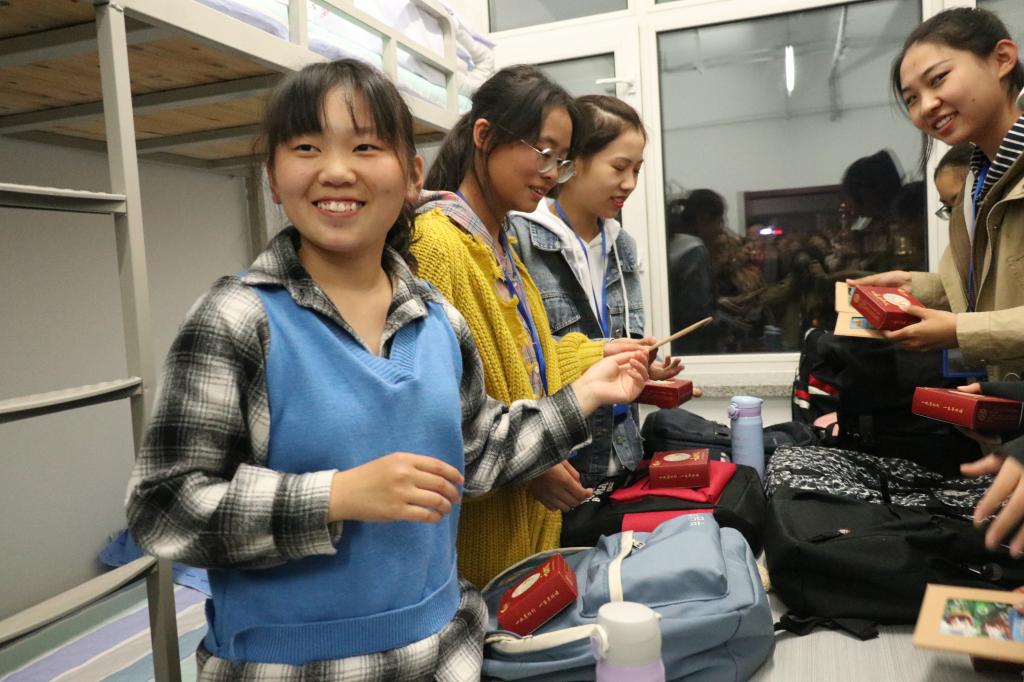 进入新生宿舍,院领导首先对同学们在军训中的坚毅态度及获得的优秀成绩提出了表扬,随后与每位新生就近期学习、生活的适应性情况进行了亲切的交谈,一声声亲人般的关切问候,一句句催人奋进的激励话语瞬间拉近了师生的距离,让来自天南海北的学子们倍感温馨,现场顿时暖意融融充满了欢声笑语。 随后学院领导和老师们把学院提前为同学们准备的中秋月饼和学院代言人“小语”、“小言”纪念版明信片发放给同大家,同学们纷纷表示感谢,现场欢呼声不断。
