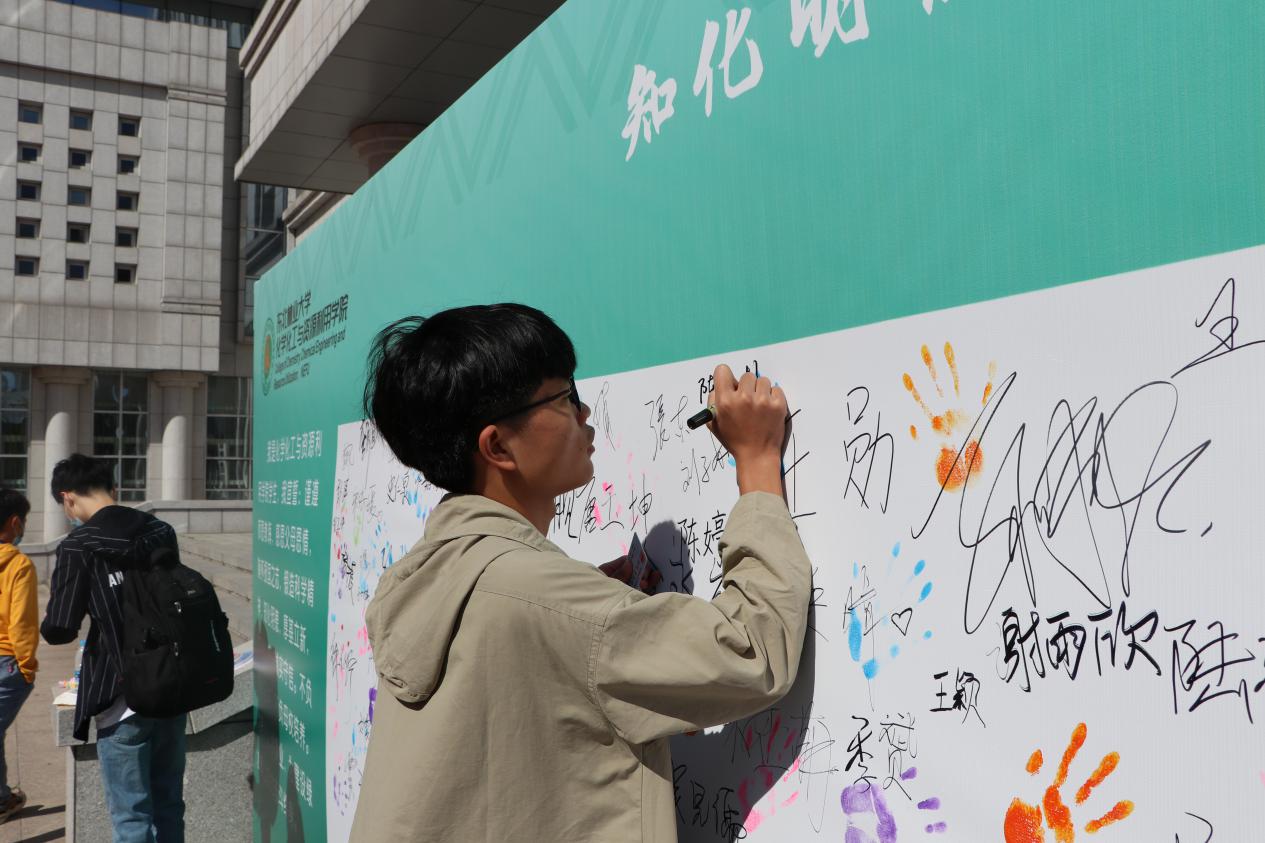 迎新现场,学院以“伴”“铭”“溯”“诺”为主题,结合“留下大学第一记忆”“许下庄严承诺”“铭刻化资印记”等迎新设计,让新同学在迎新现场留下校园里的第一张照片、参与签名墙签名留念,充分表达进入大学校园的欣喜之情和许下振兴化学事业、建设绿水青山的庄严承诺。
