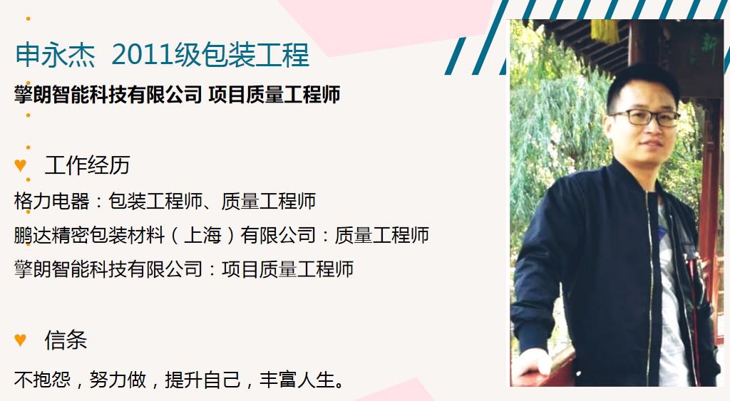 申永杰是2011级包装工程毕业生,他介绍了包装工程就业的两个主要职位:包装设计师和包装工程师。他讲述了工作职能,强调了包装材料、包装机械、包装测试等基本技能对于工作开展的重要性。本科阶段掌握的包装相关设计软件,使他在毕业便被格力公司选中。后来他将专业知识、可靠性工程和工业管理相结合,转型成为项目质量工程师。他告诉在读的学弟学妹们,在大学期间应积极参加创新项目,参加大学生专业竞赛等,要培养自己良好的逻辑思维,学好专业知识,学好英语,未来一定有更美好的发展前景。