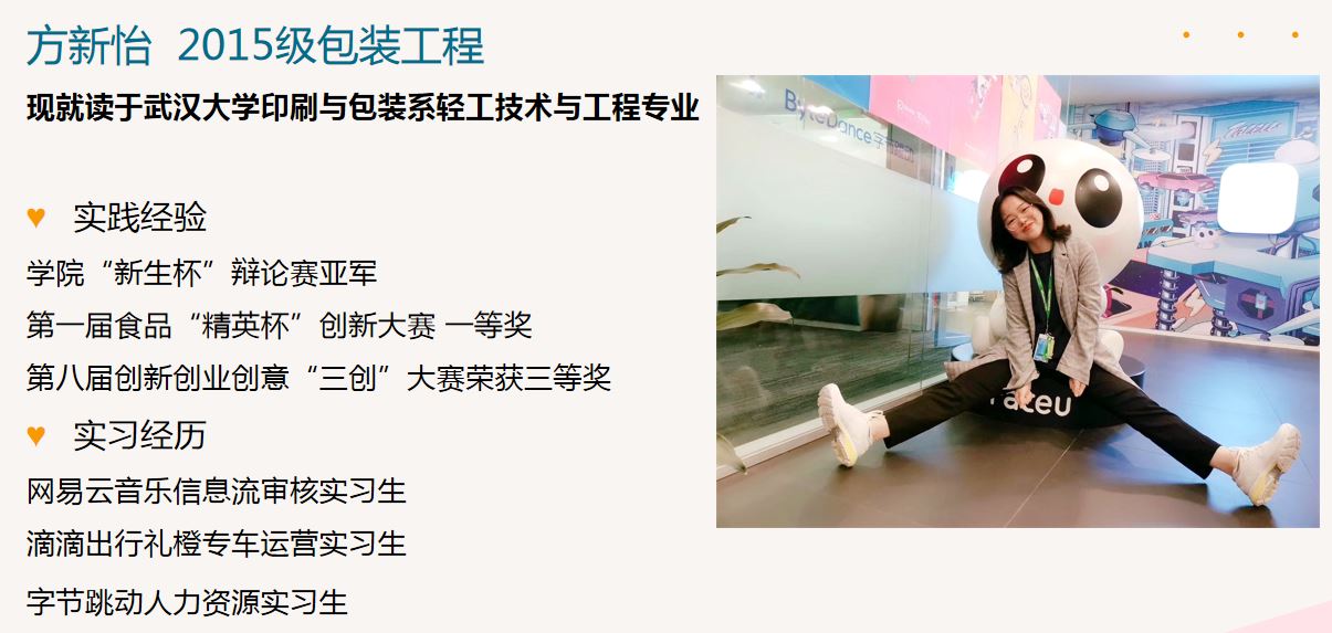 方新怡是2015级包装工程毕业生,她讲述自己大学期间,学习了很多软件,这让她发表文章的数据图表更加美观和合理;加上坚实的工科基础知识和系统的专业知识,研究生阶段学习更加得心应手。大学期间,她经常关注各大公司招聘官网的实习生板块,并投上简历,因此获得在网易、滴滴、字节跳动等多家公司实习机会,积累了丰富的体验。她推荐《把时间当做朋友》这本书,书中观点认为并非有兴趣才能把一件事做好,而是在做事情过程中才会产生把事情做好的兴趣和动力。她鼓励学弟学妹们要脚踏实地,先把握好当下,必定与美好的未来不期而遇。