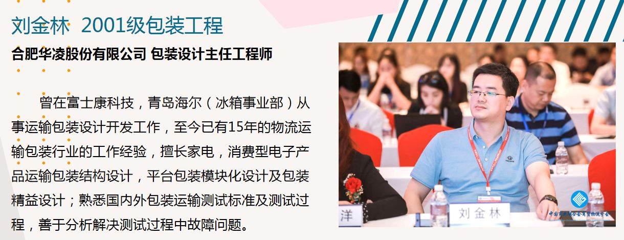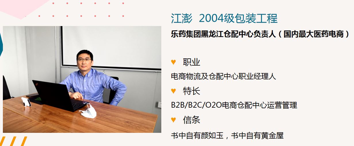 江澎是2004级包装工程毕业生,现在是国内最大医药电商黑龙江配送中心的负责人。他坦言大学期间学习的包装材料、包装工艺、运输包装等专业课知识使他对现在的管理工作得心应手。他分析了未来包装产业的发展趋势:智能包装势在必行;包装与物联网紧密结合,无人销售、无人操作、自动识别等技术与包装完美融合;包装工程师的工作更加重要,包装行业前景一片光明。最后,他告诉在读的学弟学妹们,要把握这段最美好的时光,用技能武装自己,需要有几把“刷子”,掌握更多的专业技能、办公技能,培养核心竞争力,才能在未来的竞争中立于不败之地。